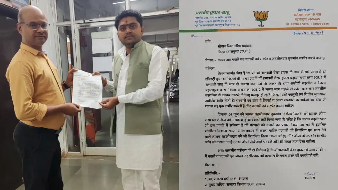महासमुंद : भूमि रिकॉर्ड में गड़बड़ी पर भाजपा नेता अशवंत तुषार साहू ने की सख्त कार्रवाई की मांग, राजस्व मंत्री व मुख्य सचिव को सौंपा ज्ञापन