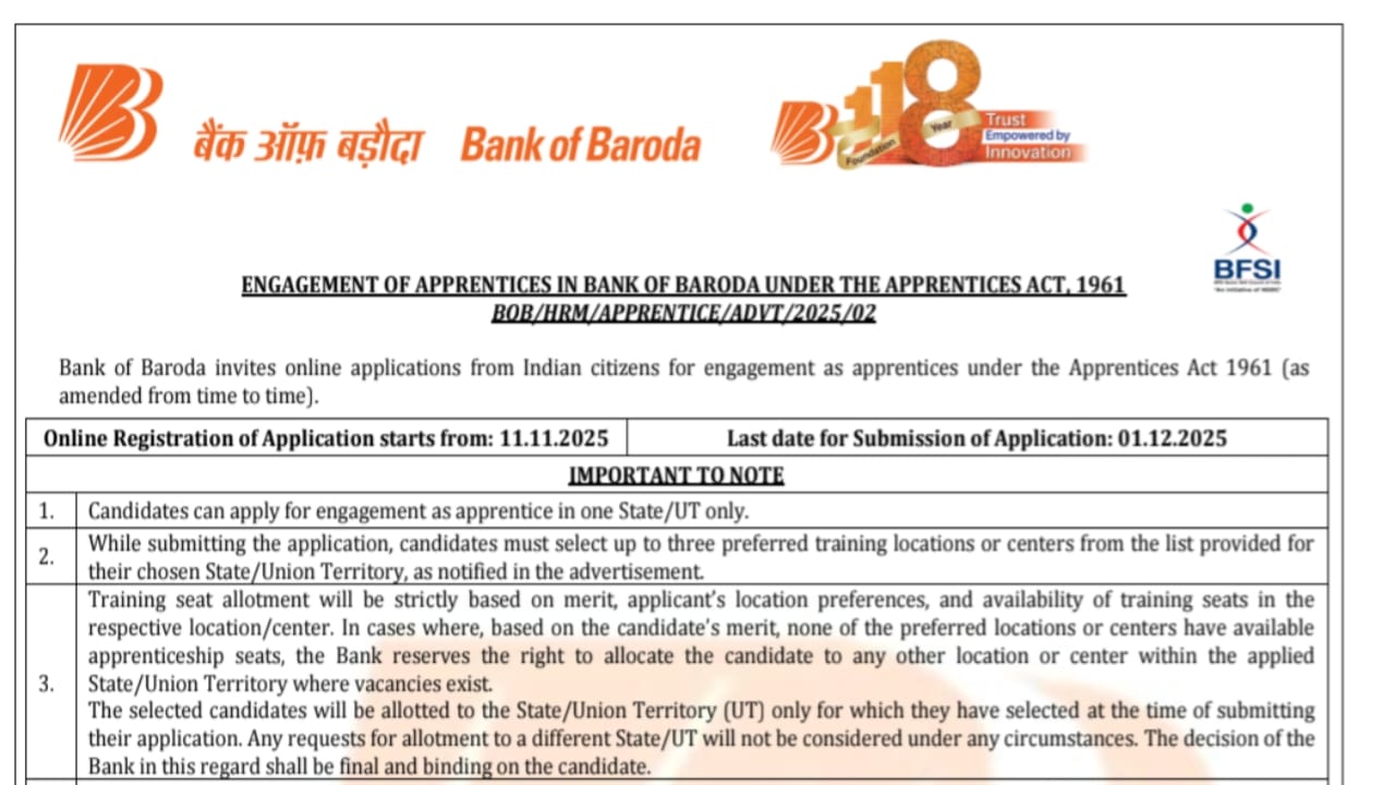 बैंक ऑफ बड़ौदा (Bank of Baroda) ने देशभर के युवाओं के लिए शानदार मौका जारी किया है। Bank of Baroda Apprentice Vacancy 2025 के तहत कुल 2700 पदों पर भर्ती निकाली गई है। इसके लिए आधिकारिक नोटिफिकेशन नवंबर 2025 में जारी किया गया है। इस भर्ती के लिए आवेदन प्रक्रिया 11 नवंबर 2025 से शुरू हो चुकी है और उम्मीदवार 1 दिसंबर 2025 तक ऑनलाइन आवेदन कर सकते हैं।