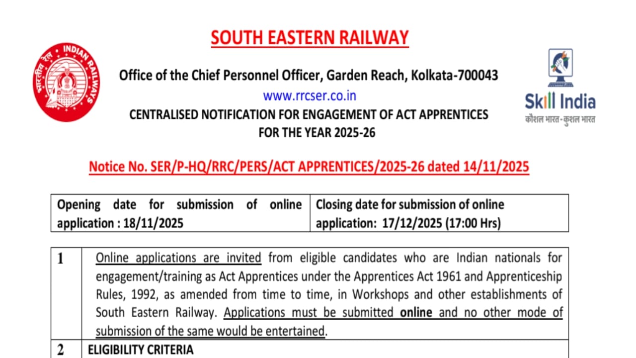 अगर आप सरकारी नौकरी के शुरुआती मंच की तलाश में हैं, तो यह Apprentice प्रोग्राम आपके लिए एक शानदार अवसर है, जिसमें आप प्रैक्टिकल ट्रेनिंग, तकनीकी अनुभव और भविष्य में स्थाई नौकरियों के बेहतर अवसर प्राप्त कर सकते हैं। उम्मीदवार पूरी जानकारी और ऑनलाइन आवेदन के लिए SER की आधिकारिक वेबसाइट ser.indianrailways.gov.in पर जाकर फॉर्म भर सकते हैं।