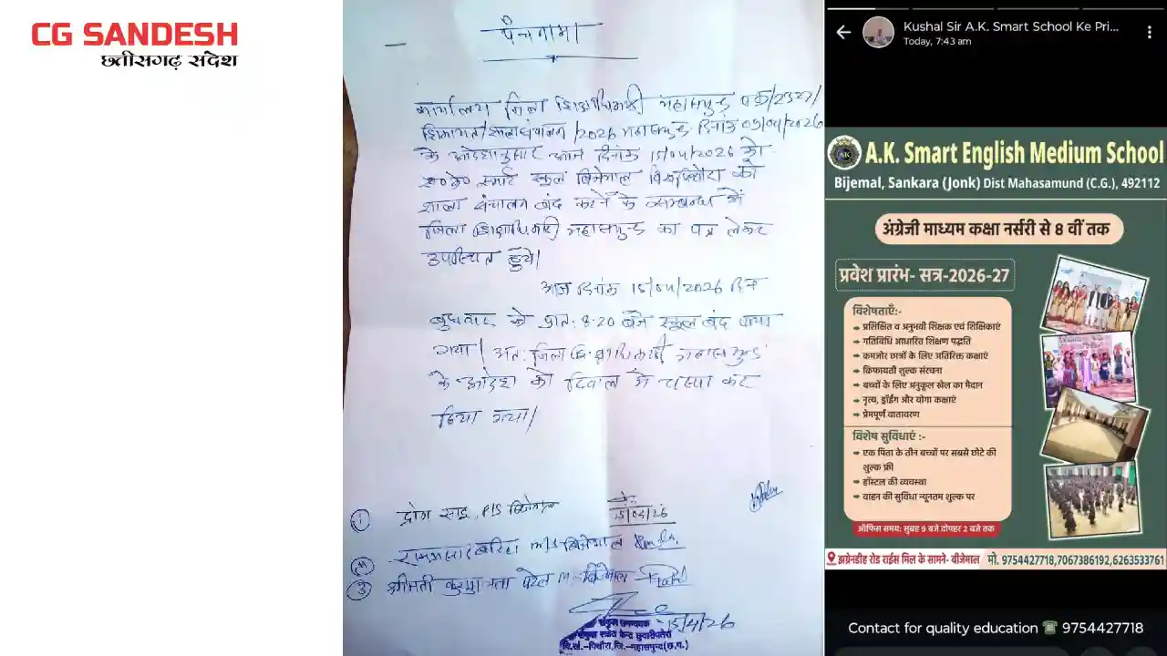 बिना मान्यता प्राप्त किये निजी स्कूल ए. के. स्मार्ट इंग्लिश मिडियम स्कूल बिजेमाल को संचालित करने का मामला महासमुन्द कलेक्टर के संज्ञान में आने के बाद स्कूल को बंद करने का आदेश किया गया। इस आदेश के बाद भी निजी स्कूल के संचालक ने अपने वाटशप स्टेट्स में डिजिटल प्रचार कर रहा है। बकायदा शैक्षणिक वर्ष 2026-27 में स्कूल संचालित होने का दावा किया है, वही संकुल समन्वयक छुवारीपतेरा ने इस निजी स्कूल का निरीक्षण करके बंद पाये जाने पर पंचनामा तैयार कर दीवाल में आदेश को चस्पा कर दिया है।