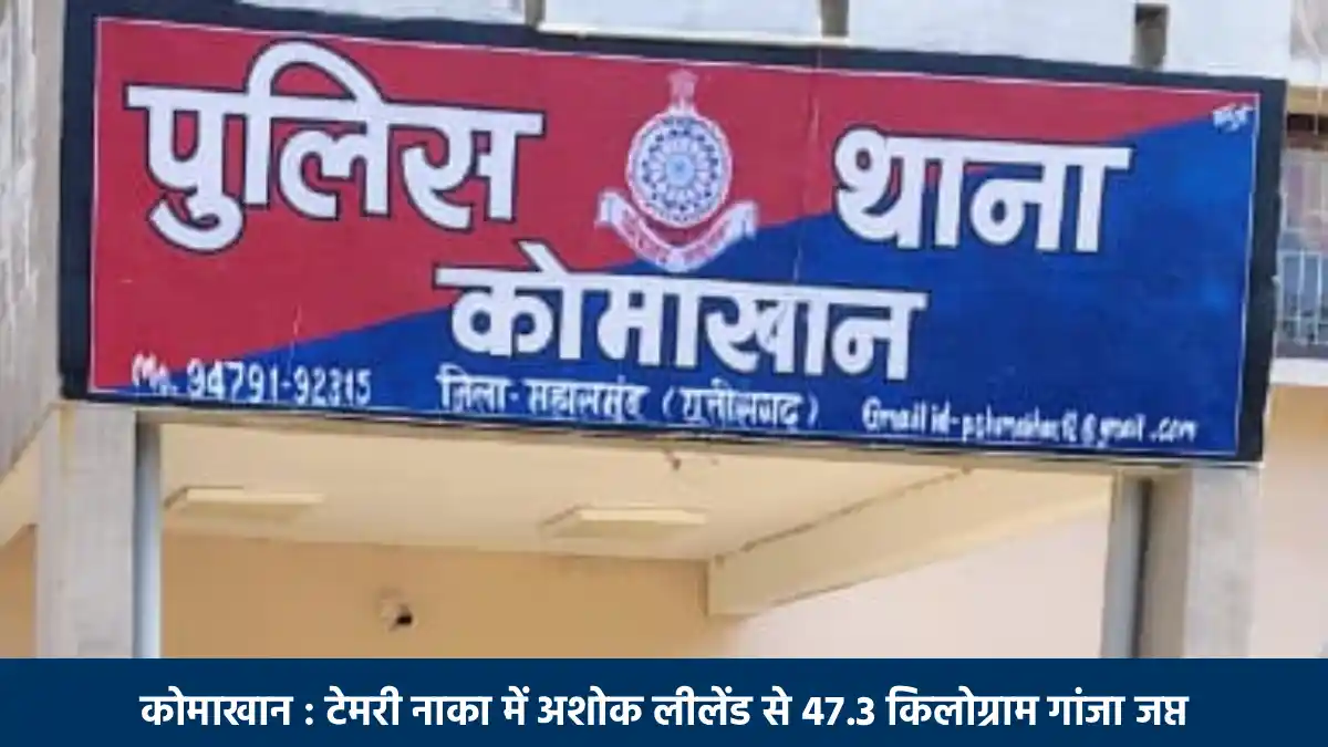 कोमाखान पुलिस ने 19 अप्रैल 2026 को टेमरी नाका में एक ट्रक से 47.3 किलोग्राम गांजा जप्त किया है. जिसकी कीमत 23 लाख 65 हजार रूपये बताई गई है.