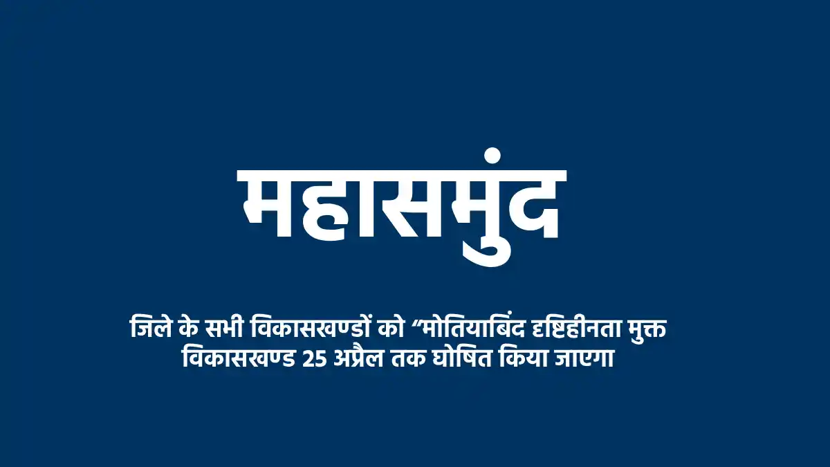 कलेक्टर श्री विनय कुमार लंगेह के निर्देशानुसार राष्ट्रीय अंधत्व नियंत्रण कार्यक्रम के तहत् महासमुंद जिले के समस्त विकासखण्डों को मोतियाबिंद दृष्टिहीनता मुक्त विकासखण्ड 25 अप्रैल 2026 तक घोषित किया जाएगा। डॉ. अनिल कुमार गोरियार, जिला नोडल अधिकारी राष्ट्रीय अंधत्व नियंत्रण कार्यक्रम ने बताया कि मिशन संचालक, राष्ट्रीय स्वास्थ्य मिशन के द्वारा महासमुंद जिले को वर्ष 2025-26 में 5000 मोतियाबिंद ऑपरेशन का लक्ष्य दिया गया था।