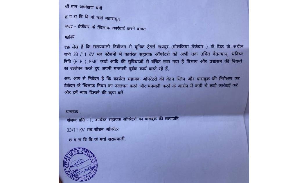 उन्होंने शिकायत पत्र में बताया है की सरायपाली डिवीजन में यूनिक ट्रेडर्स रायपुर (ढोलकिया ठेकेदार) के टेंडर के अधीन सभी 33 /11 KV सब स्टेशनों में कार्यरत सहायक ऑपरेटरों को अभी तक उचित वेतनमान, भविष्य निधि (PF), ESIC कार्ड आदि की सुविधाओं से वंचित रखा गया है और ठेकेदार विभाग और प्रशासन के नियमों का उल्लंघन करते हुए अपनी मनमानी पूर्वक कार्य करते रहे हैं.